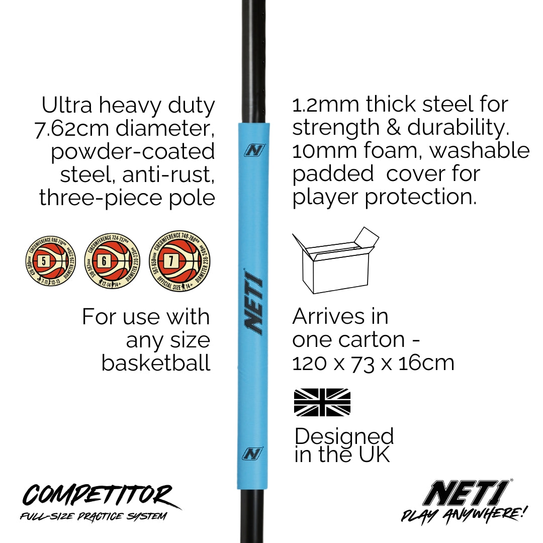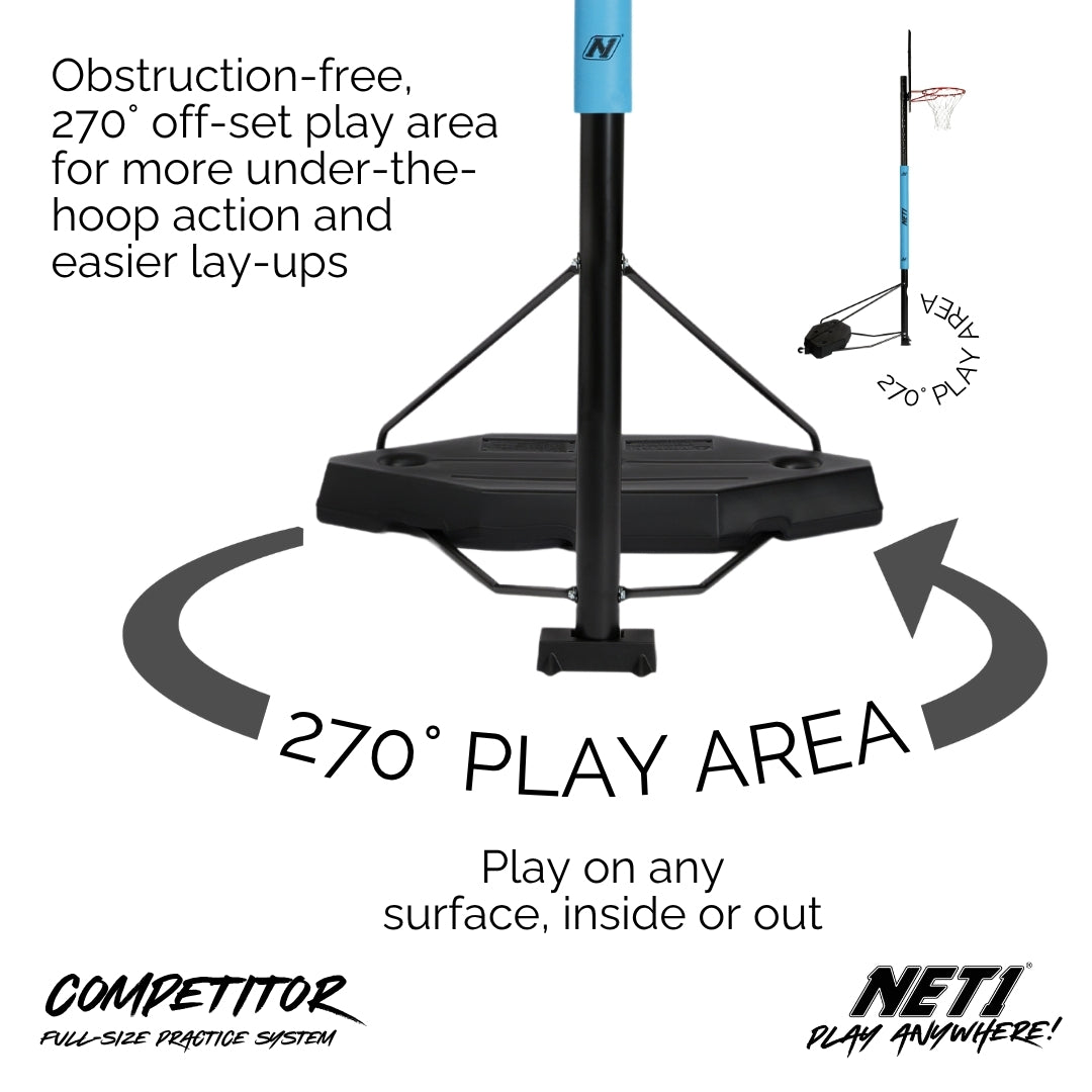 Competitor features our fully portable blow-moulded offset Hex Base. Hex can be effortlessly wheeled around on two integrated wheels and offers a 270° playfield thanks to its recessed base. We designed the Hex Base to make lay-ups and under-the-hoop play just that little bit easier.