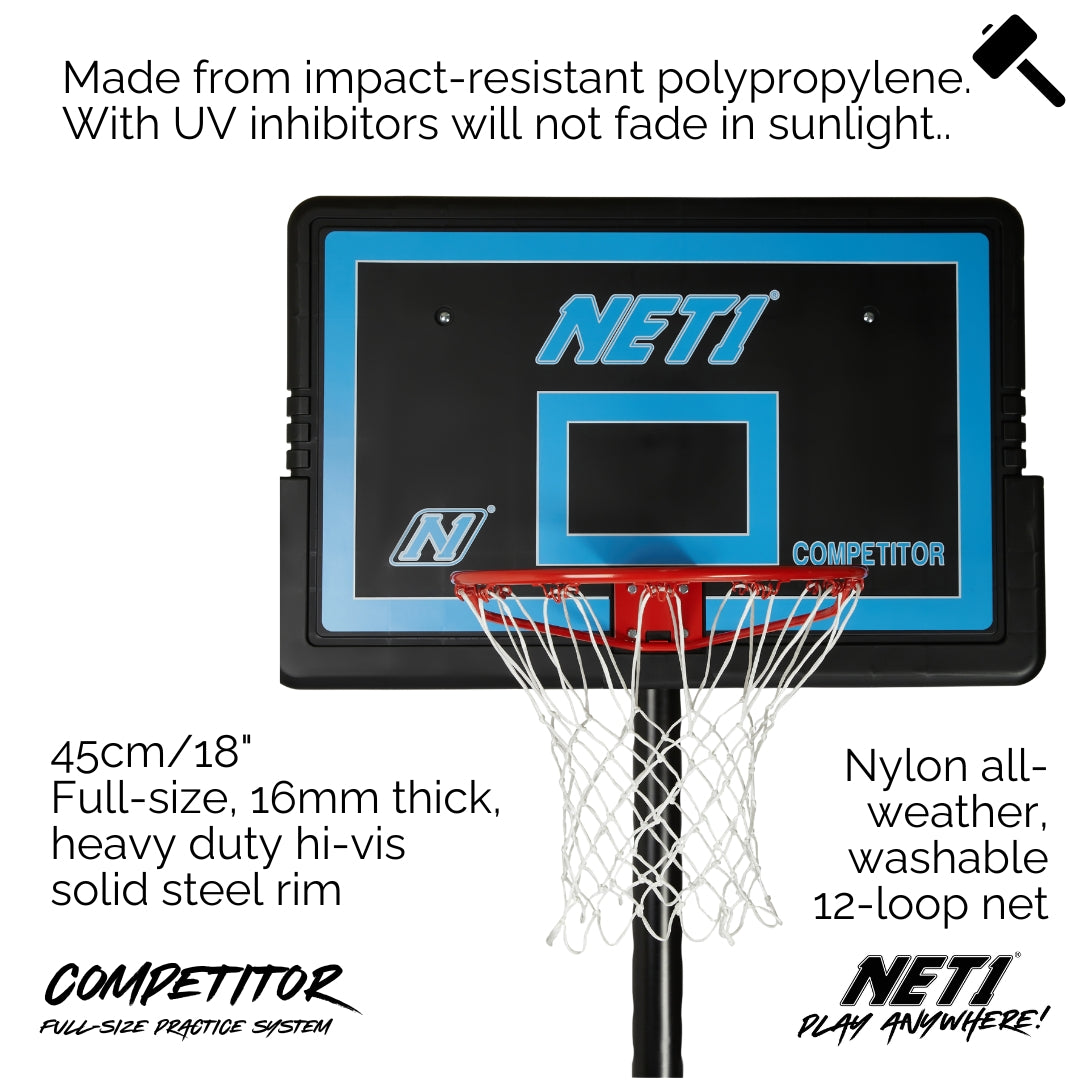 NET1 Competitor is an entry-level adult basketball system designed for players who’ve outgrown NET1’s junior hoops and are looking for their first full-size personal basketball experience.